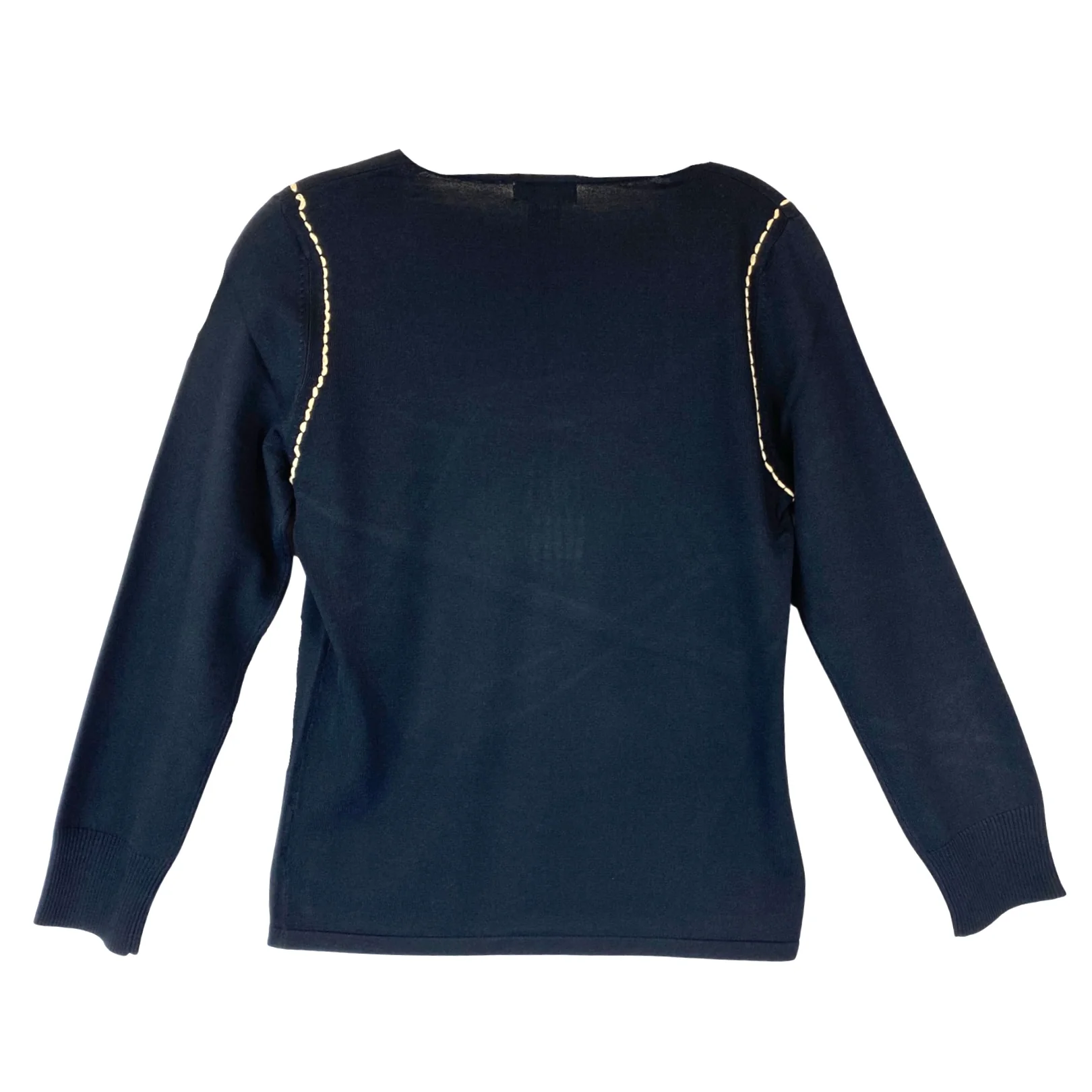 - Long sleeved stretchy knit top with contrast stitch detailing
