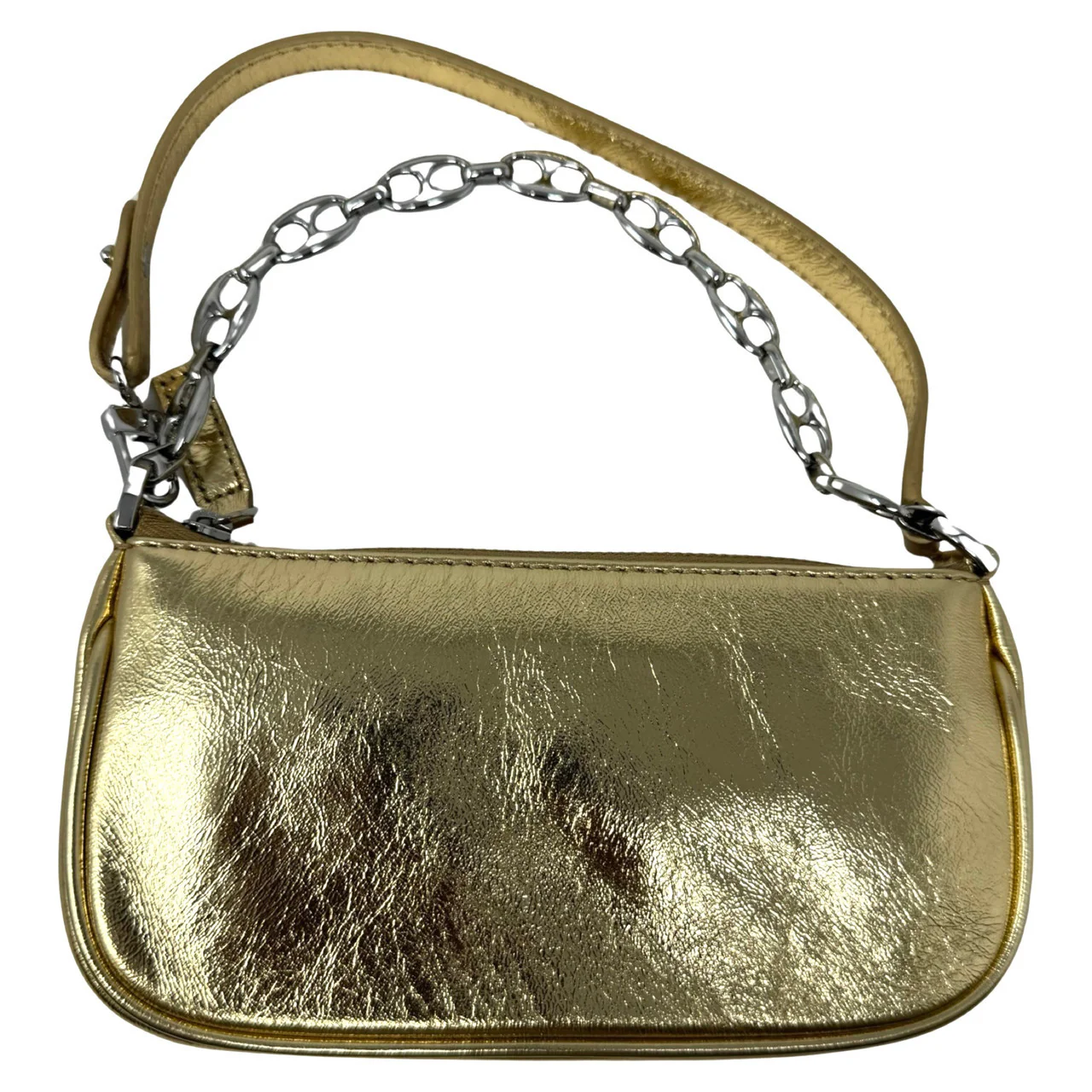 - Petite minimal handbag with thin handle strap, chain strap and zip closure
