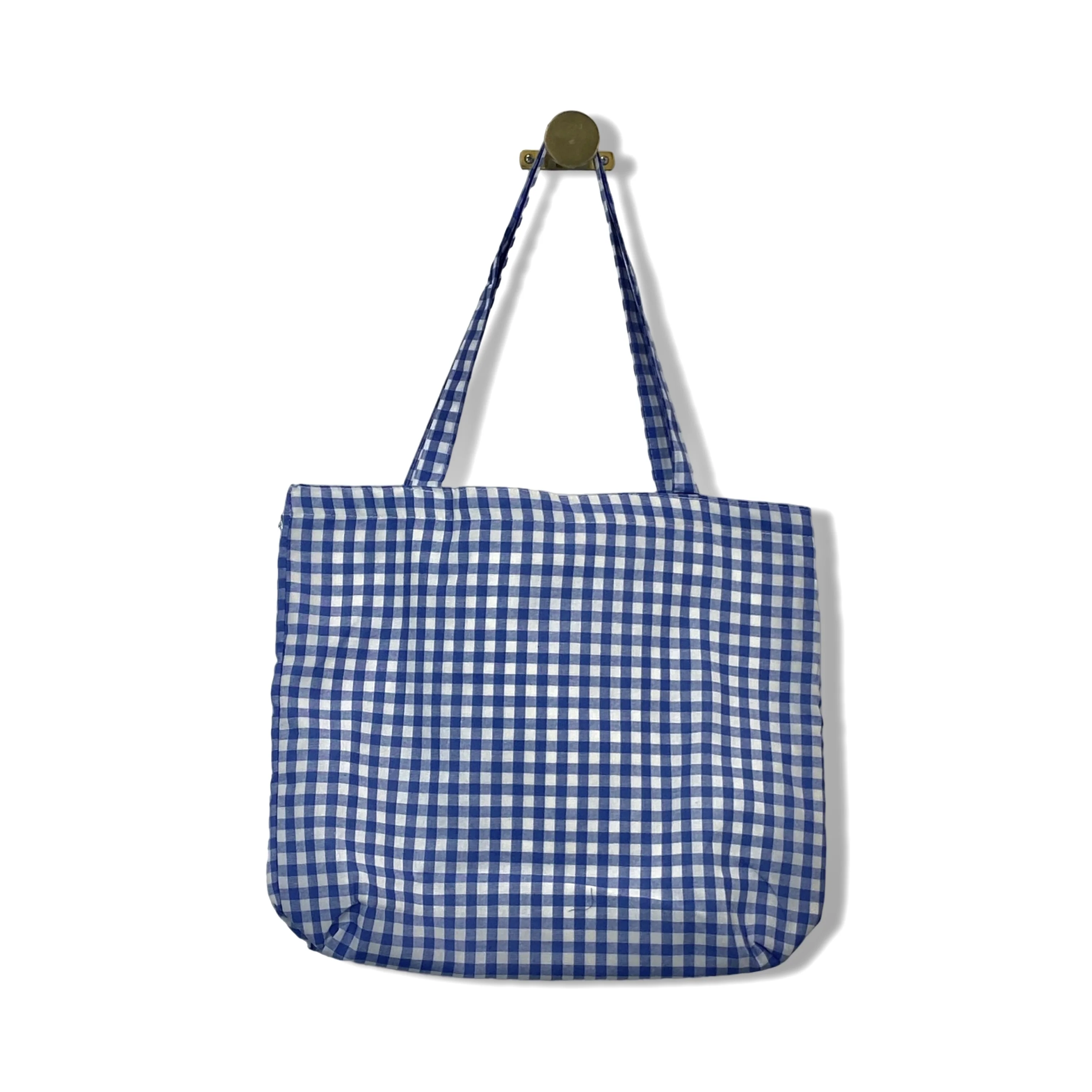 - Canvas tote bag with gingham pattern overlay, interior pockets, and snap closure.