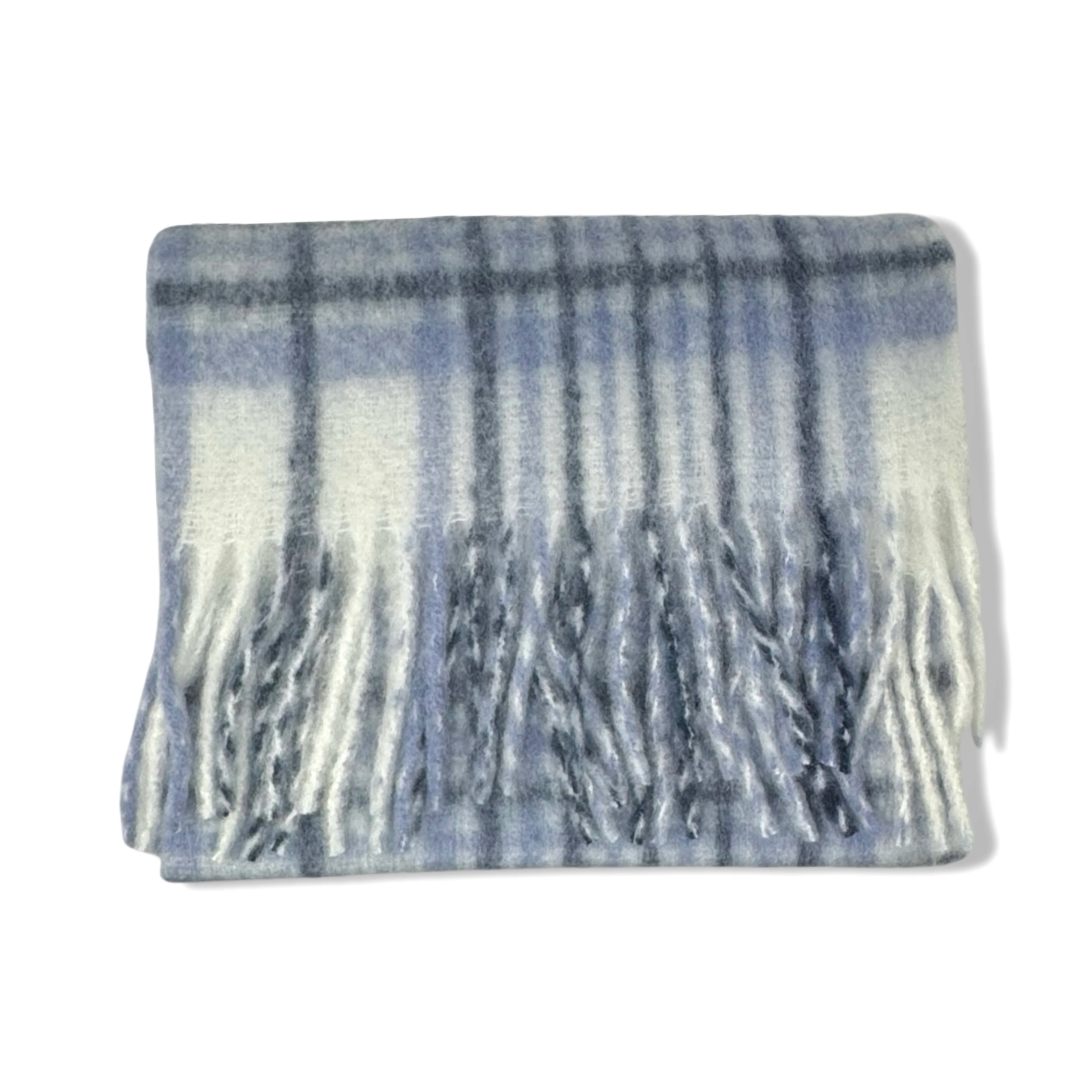- Wool blend scarf with check pattern and fringe detail on ends.