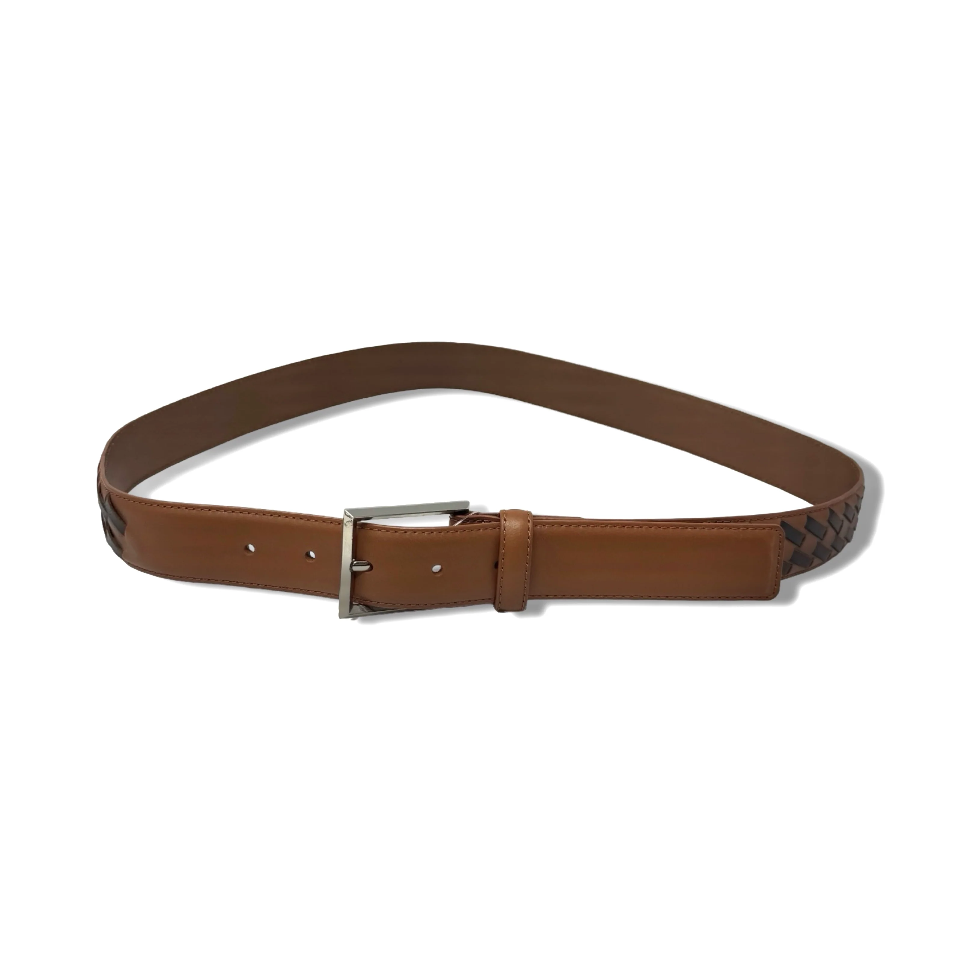 - Faux leather belt with diagonal strips and silver square belt buckle.