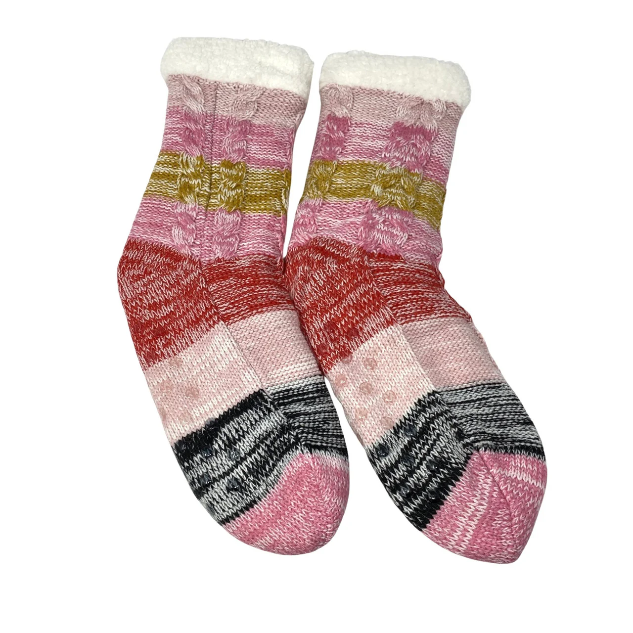 - Striped knit socks with a rubber grip bottom and sherpa lining.