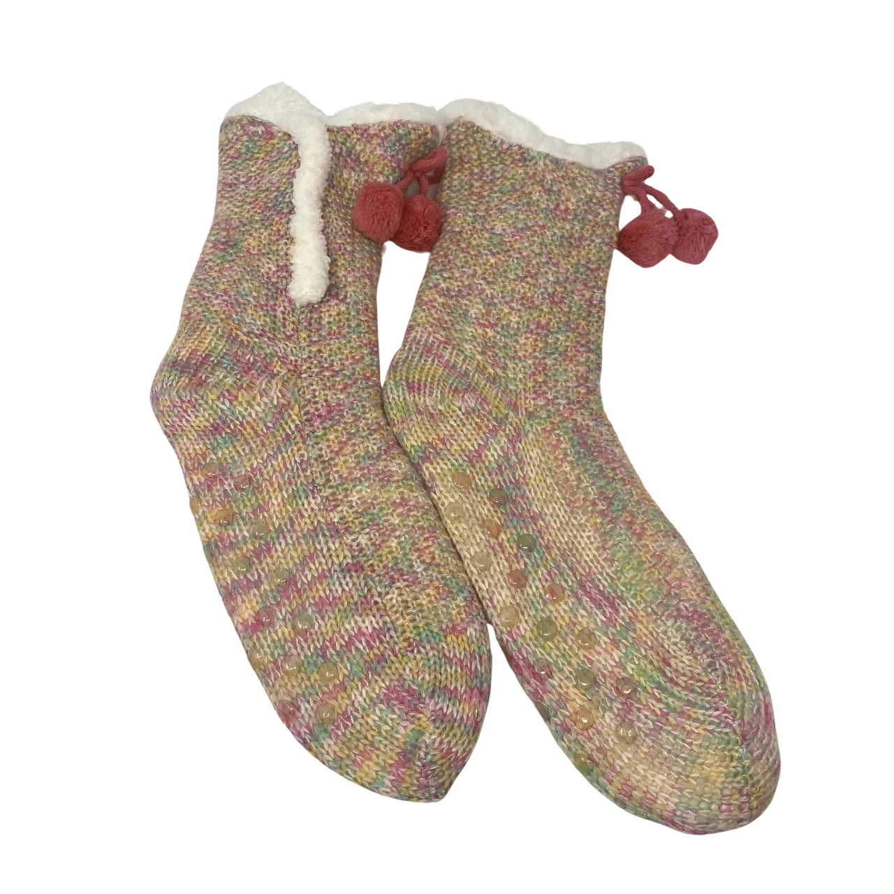 - Knit multicolor socks with a tie and pom pom detail near the top and sherpa lining.