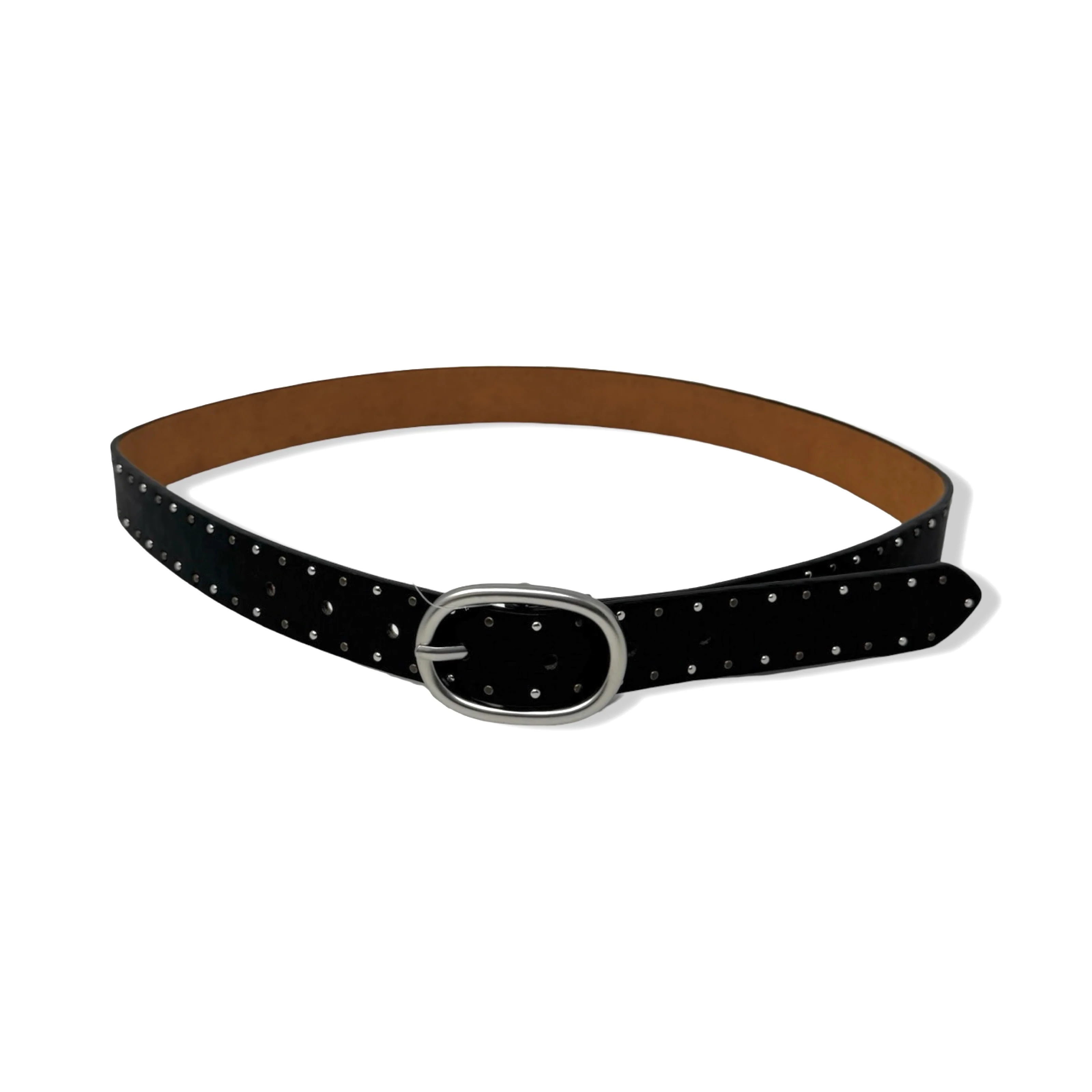 - Faux leather belt with two-tone stud detail on edges and oval matte buckle.